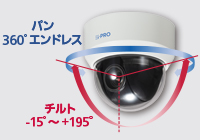パン&チルト&光学ズーム 水平回転範囲:360°エンドレス旋回 垂直回転範囲:-15°~+195 光学ズーム:21倍 |