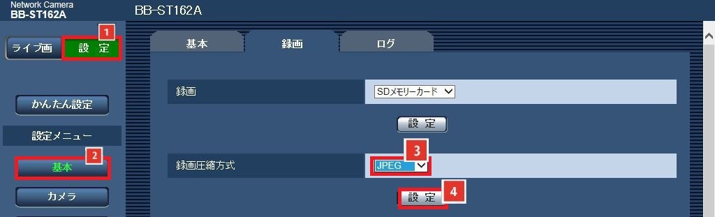 (4)「録画圧縮方式」を「JPEG」に変更してください。