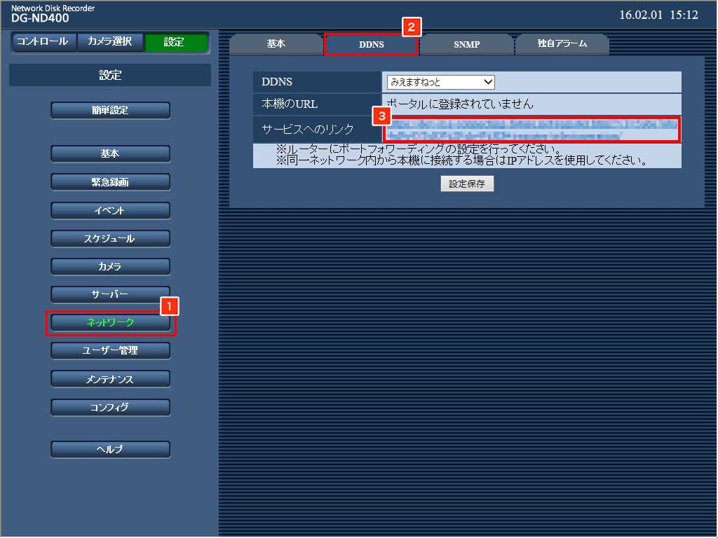 DDNS設定の「サービスへのリンク」に表示されたURLをクリックします。