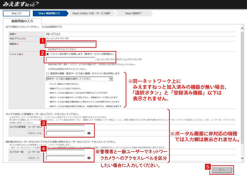 以上で機器情報の入力は完了です。続いて、お支払い方法の登録とサービス選択を行います。