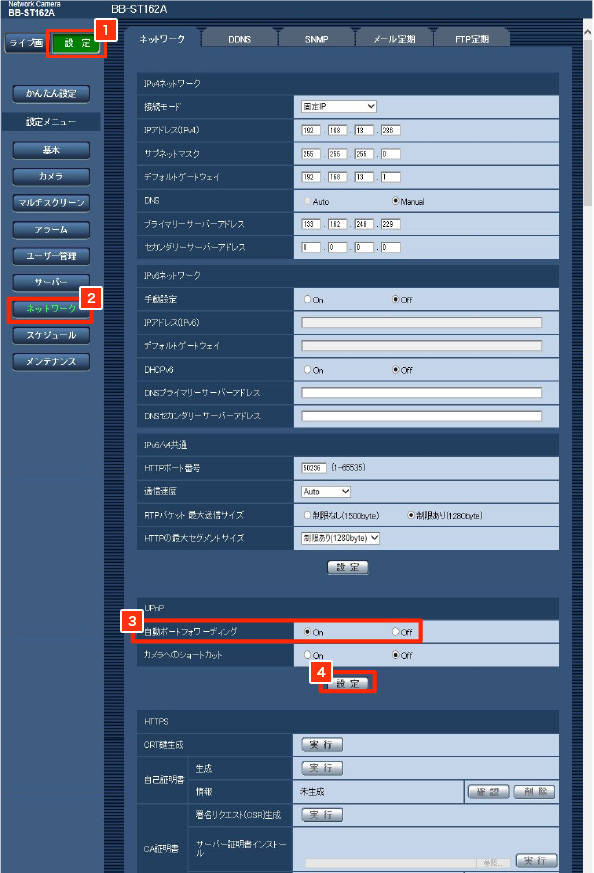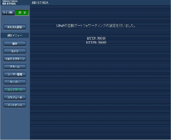 ※自動ポートフォワーディングにより、ネットワークカメラのポート番号が自動的に変更される場合があります。レコーダーや録画ソフトなど、ネットワークカメラのポート番号を登録している機器がある場合は、自動ポートフォワーディング設定後のポート番号に設定し直してください。