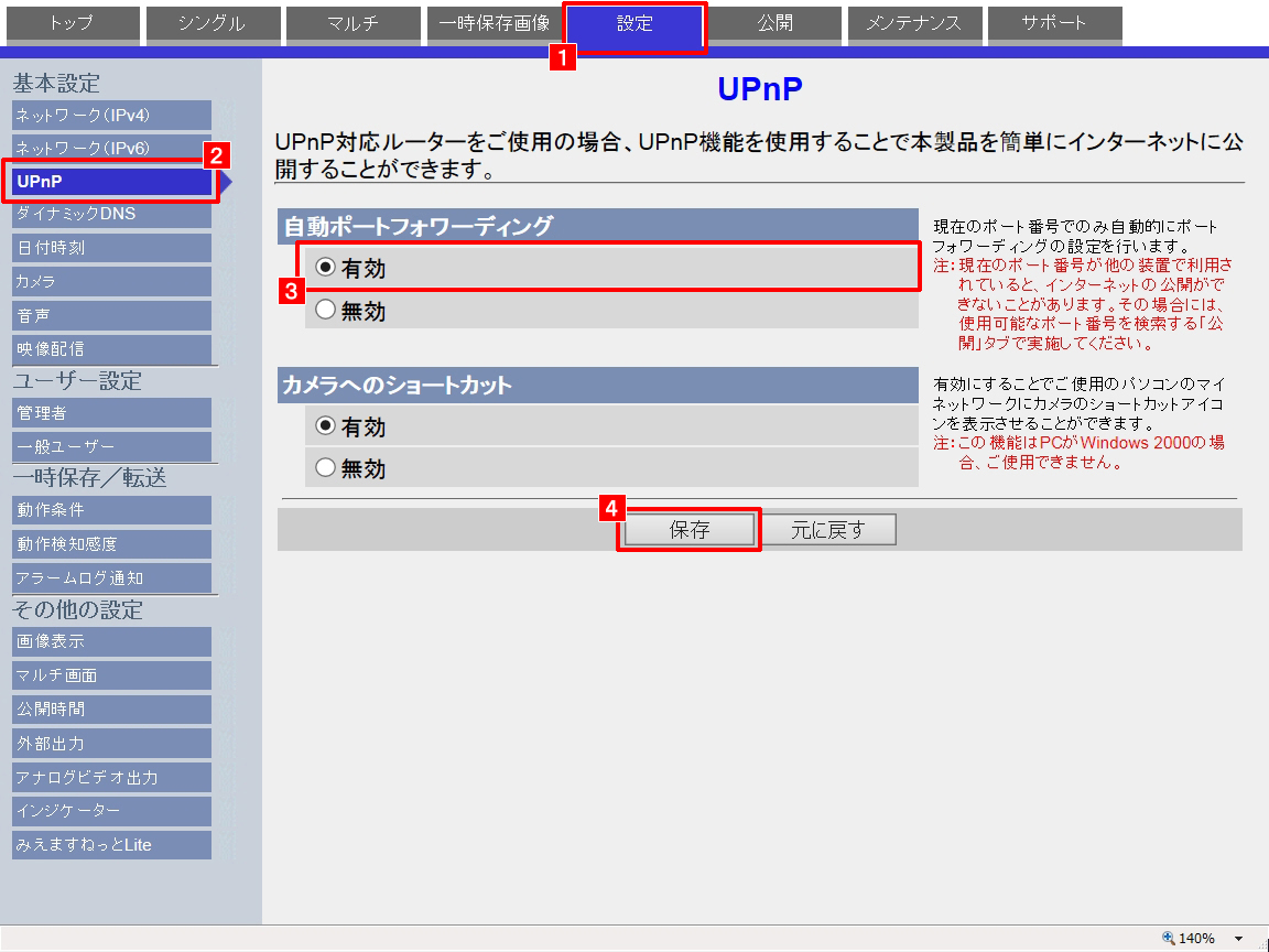 ・ポートフォワーディングを手動で設定済みの場合はこの操作は行わず、次のステップへ進んでください。自動ポートフォワーディングの設定を行うと、ポート番号が変更され、それまでご使用のポート番号で閲覧できなくなる場合があります。