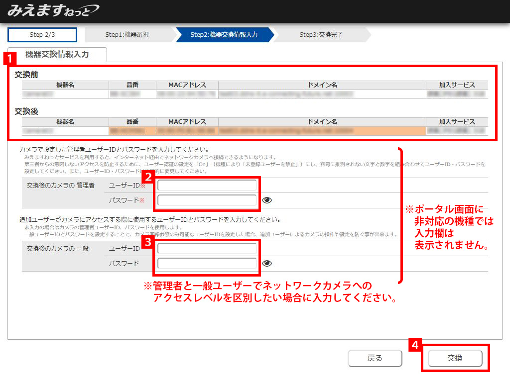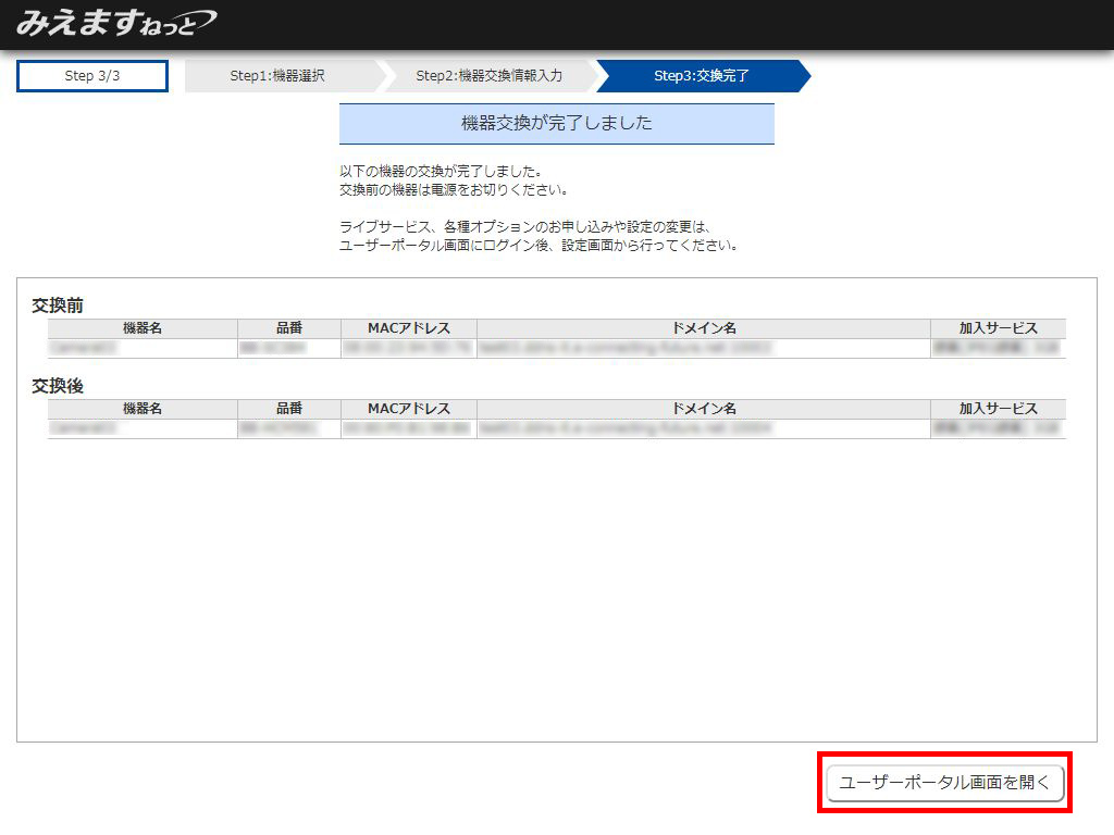 3.機器交換完了画面が表示されます。交換内容をご確認ください。