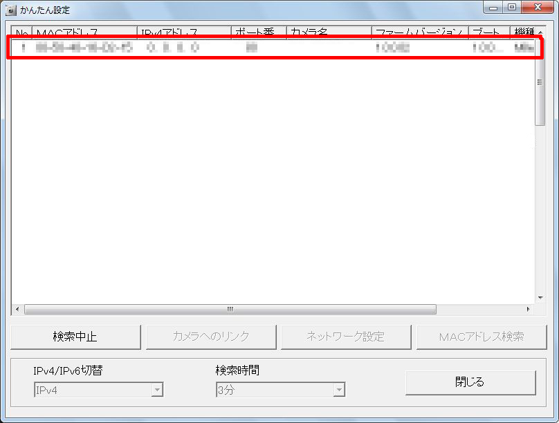 画面にカメラが 2 台以上表示された場合は、設定したいカメラに貼られているラベルに記載の MAC アドレス(00-80-F0 で始まる英数字)と同じカメラを選択してください。