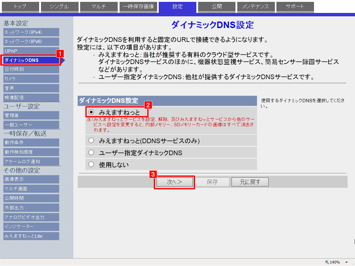 1.DDNSサービスを「みえますねっと」に設定します。