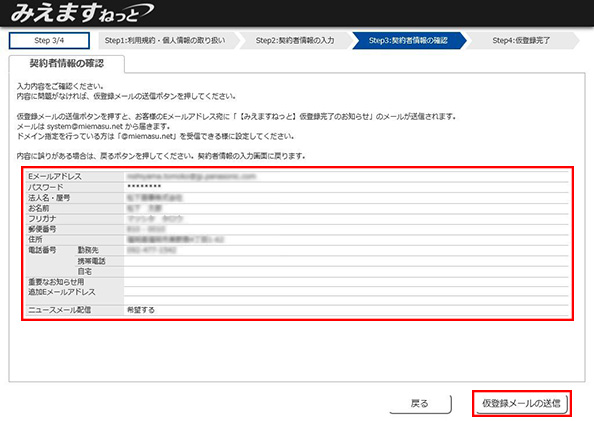 表示内容を確認し、「仮登録メールの送信」をクリックします。
