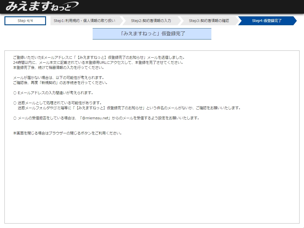 ※仮登録完了画面は、ブラウザーの閉じるボタンで終了してください。