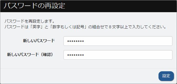 4.「新しいパスワード」入力欄と「新しいパスワード(確認)」入力欄に新しいログインパスワードを入力し、[設定]ボタンをクリックします。