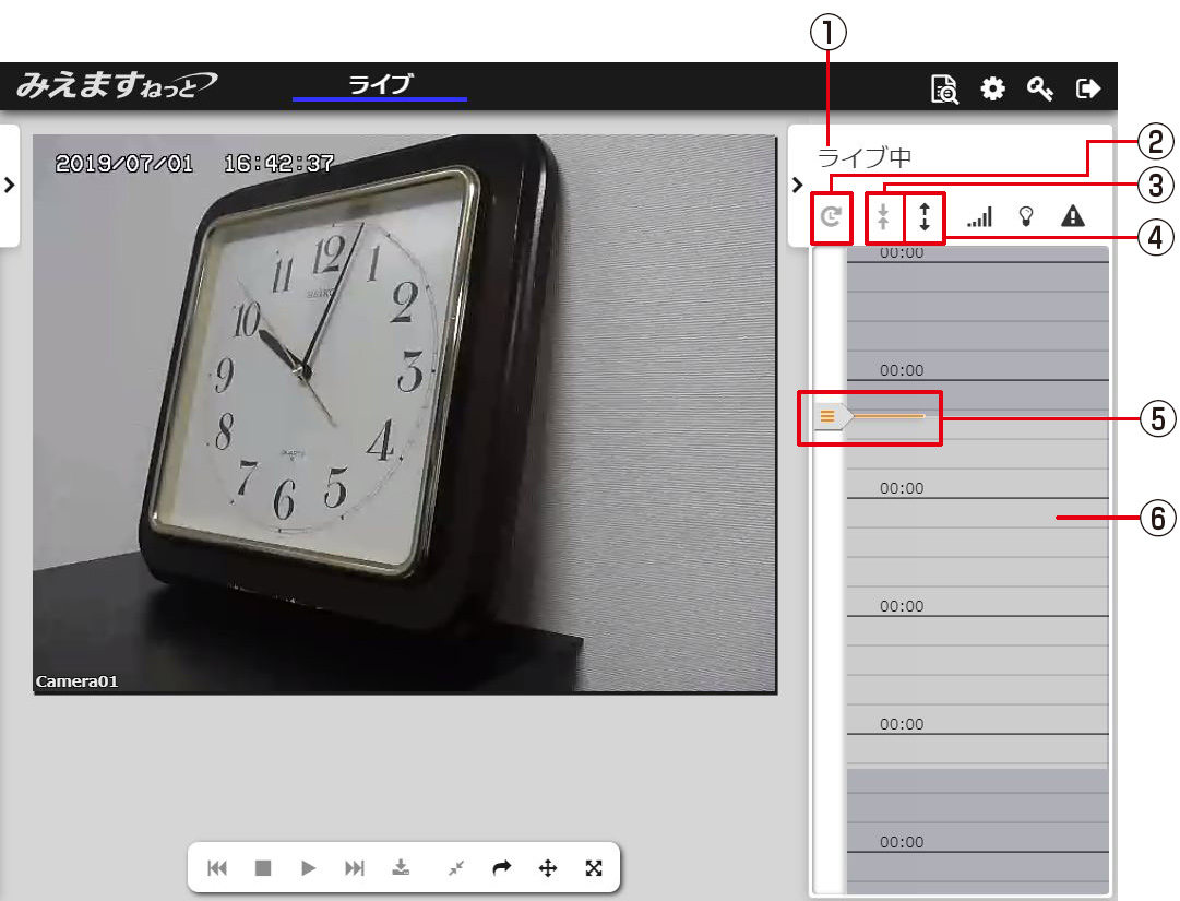 | ②[ライブへ]ボタン | クリックすると機器のライブ画像を表示します。 |