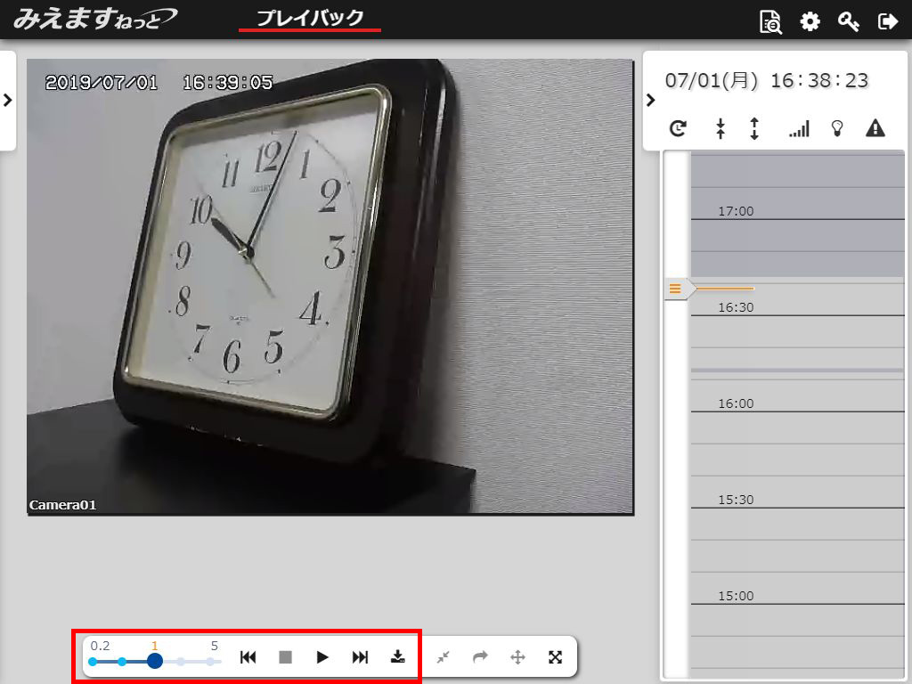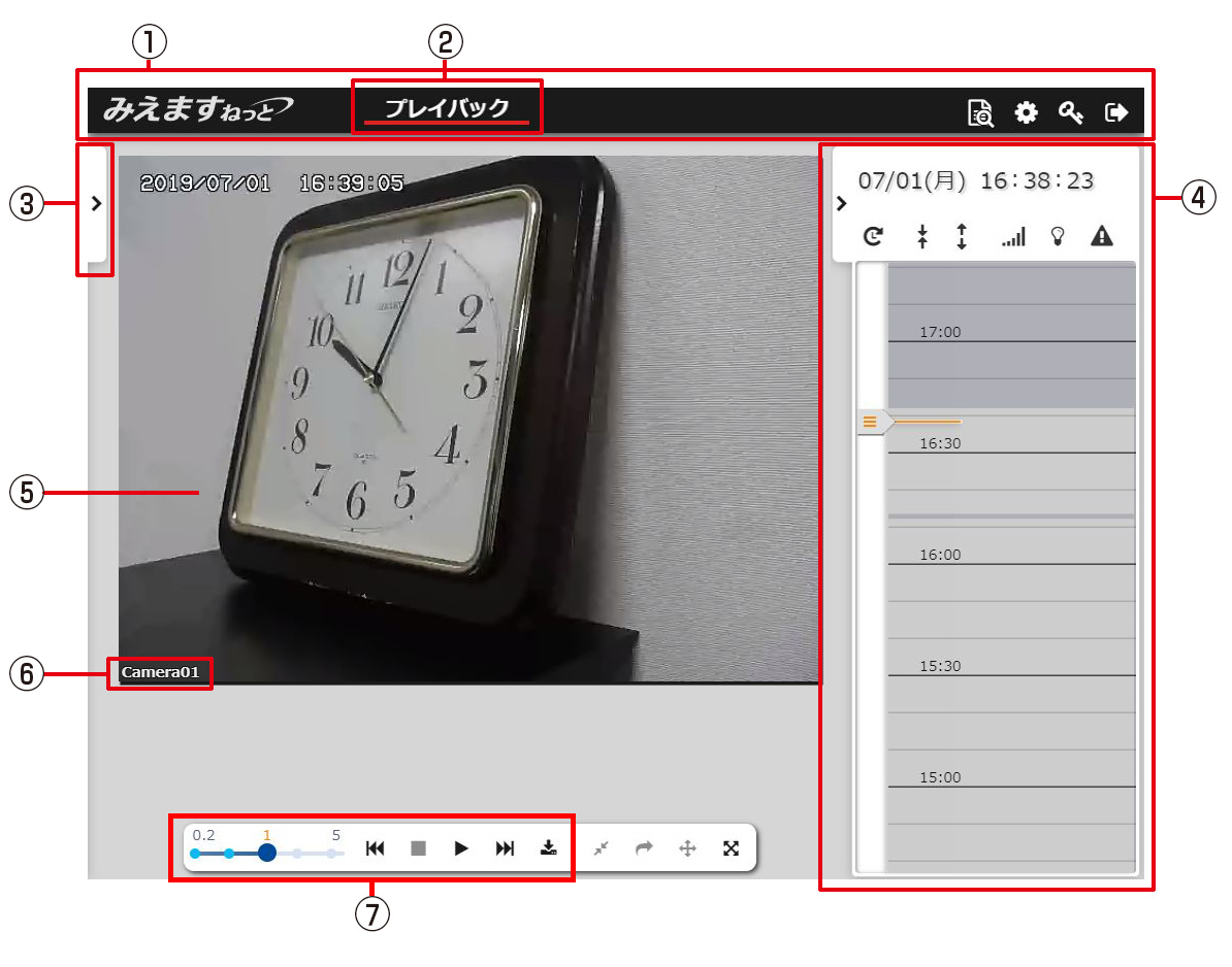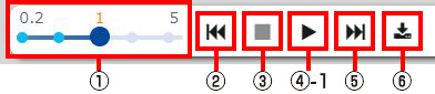 | ① | 再生速度指定スライダー | 画像の再生速度を設定します。0.2倍速/0.5倍速/1倍速/3倍速/5倍速から選択します。 |
