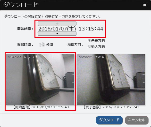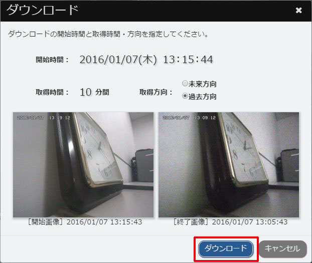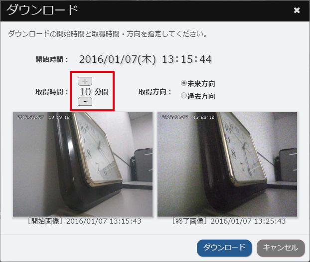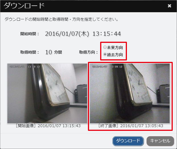 - 手順3で選択した開始時間から先の画像をダウンロードするときは、「未来方向」を選択します。