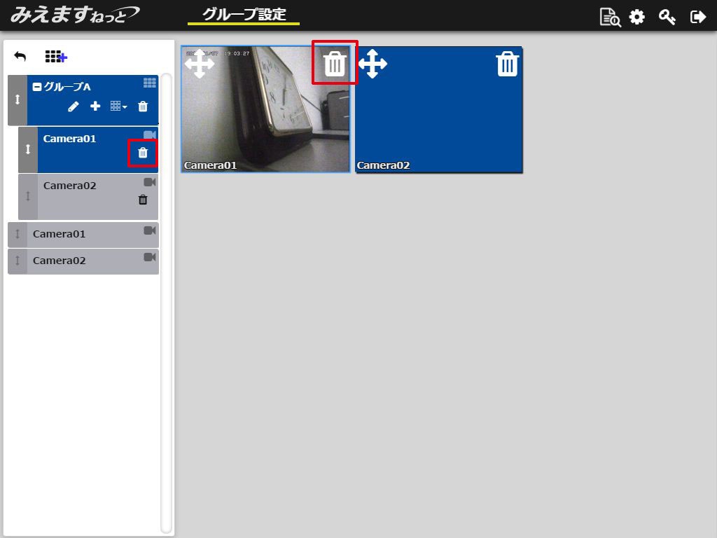 4.削除する機器の[グループ内機器削除]ボタン、または画像上に表示されている[グループ内機器削除]アイコンをクリックします。