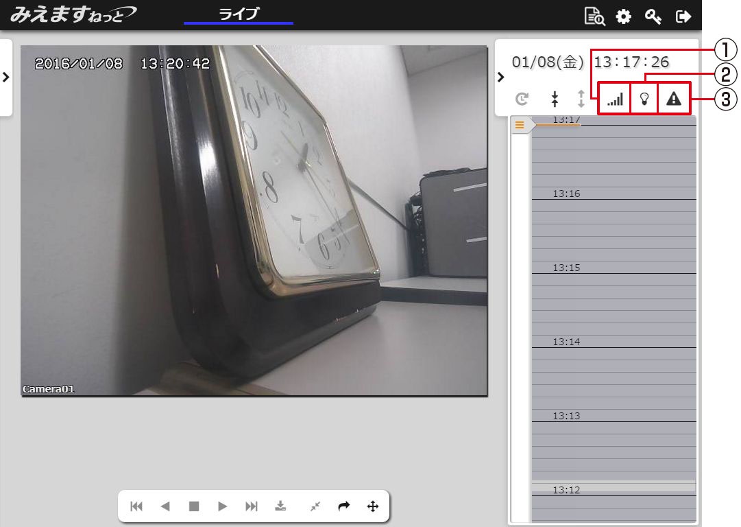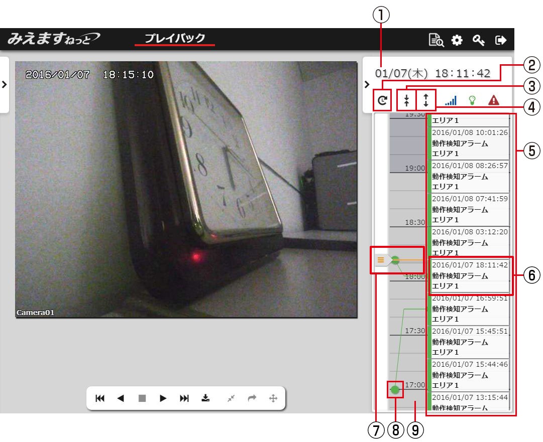 - 録画オプションに加入している機器で、録画履歴のある日時を選択したときは、録画画像を再生することができます。