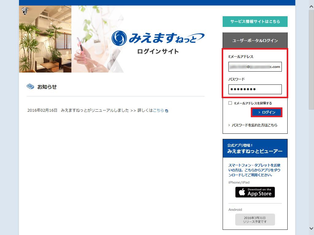管理機能を利用するためには、みえますねっとへ契約者Eメールアドレスにてログインする必要があります。