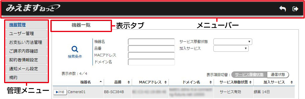 管理機能画面の初期表示は、機器管理の機器一覧表示画面となります。