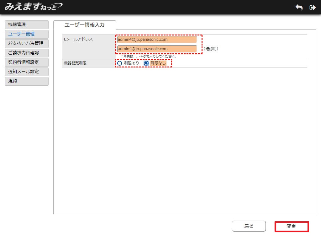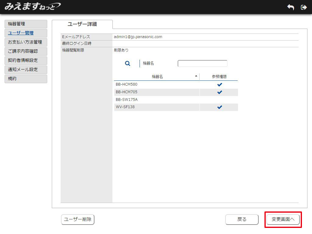 機器閲覧制限を選択し、「変更」ボタンをクリックしてください。機器閲覧制限の選択については、ユーザーを登録するをご確認ください。