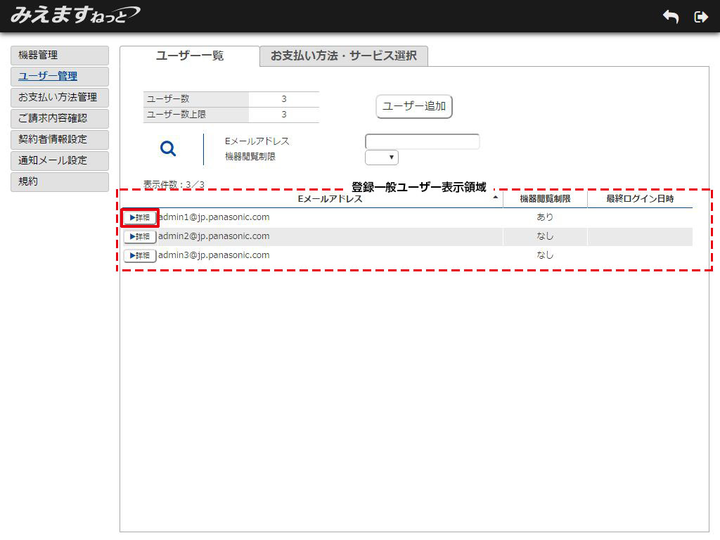 2.ユーザー一覧画面が表示されます。登録一般ユーザー表示領域から、削除するユーザーのEメールアドレスの「詳細」ボタンをクリックしてください。