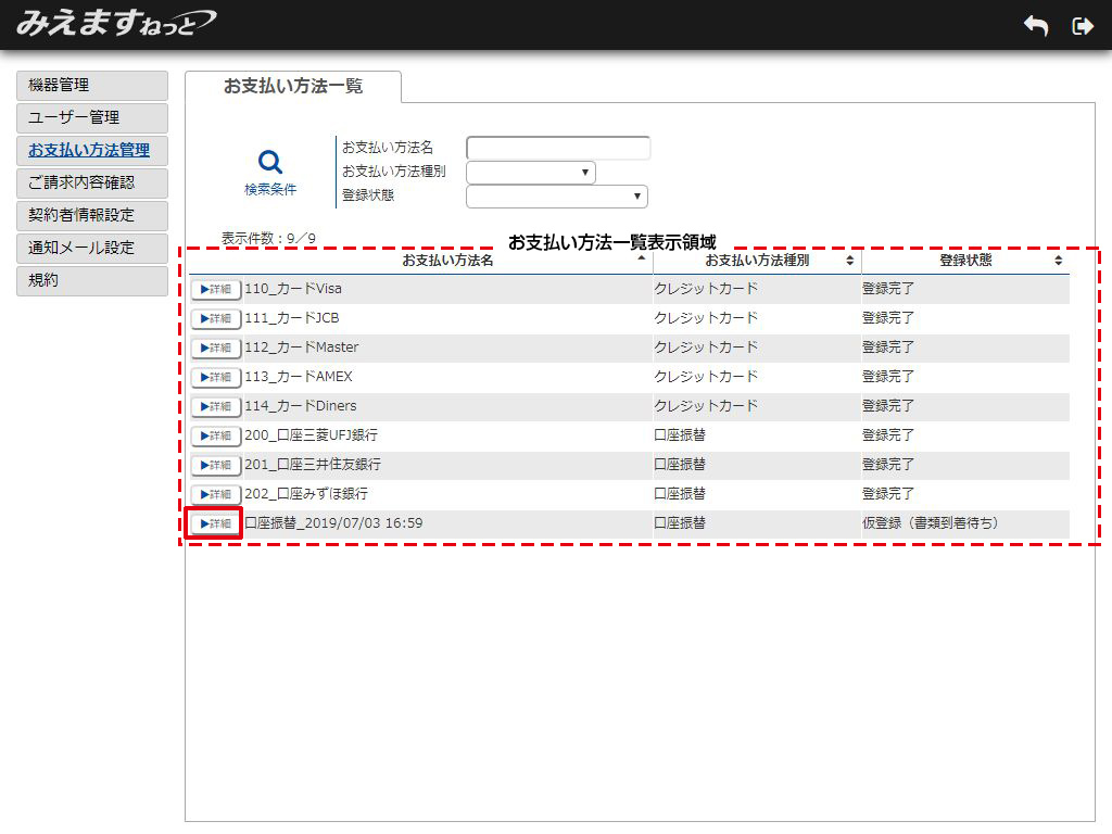2.お支払い方法一覧画面が表示されます。お支払い方法一覧表示領域から再印刷を行いたい口座振替の「詳細」ボタンをクリックしてください。