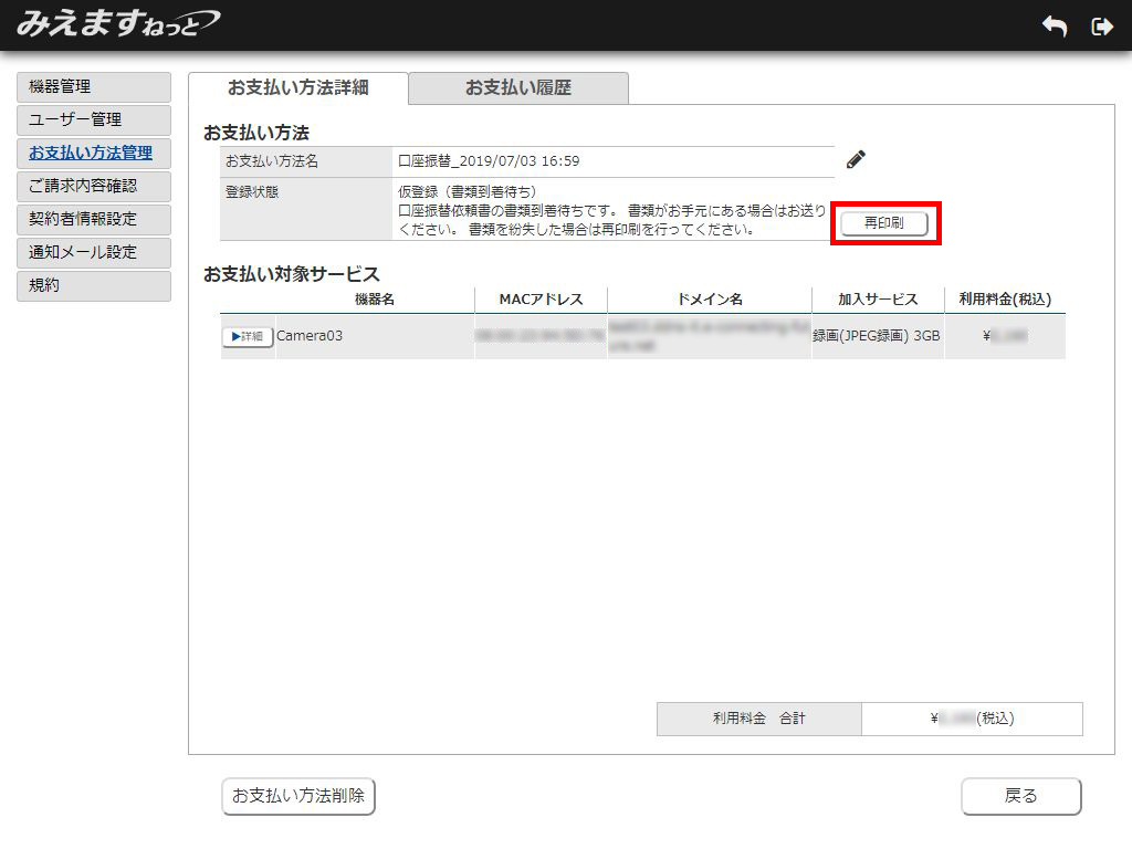3.お支払い方法詳細画面が表示されます。「再印刷」ボタンをクリックしてください。