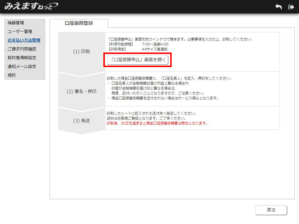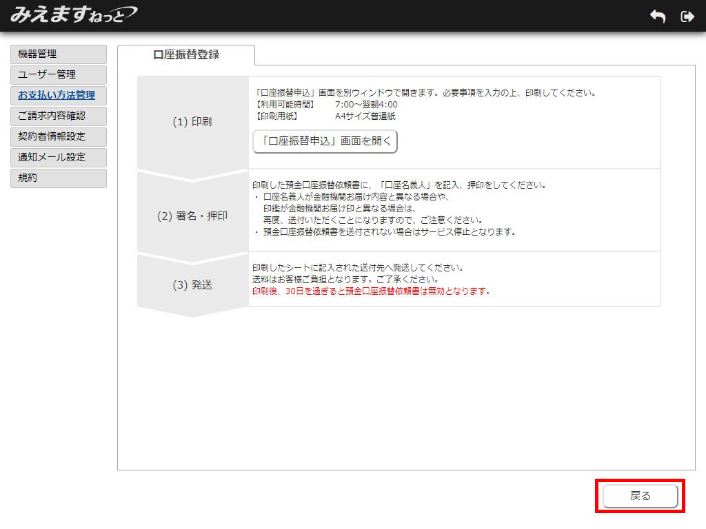 12.口座振替登録画面が表示されます。「戻る」ボタンをクリックして、前の画面に戻ってください。