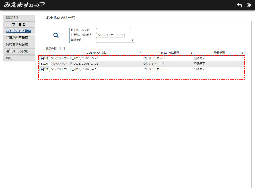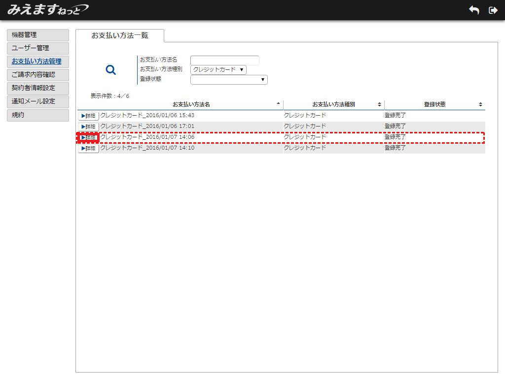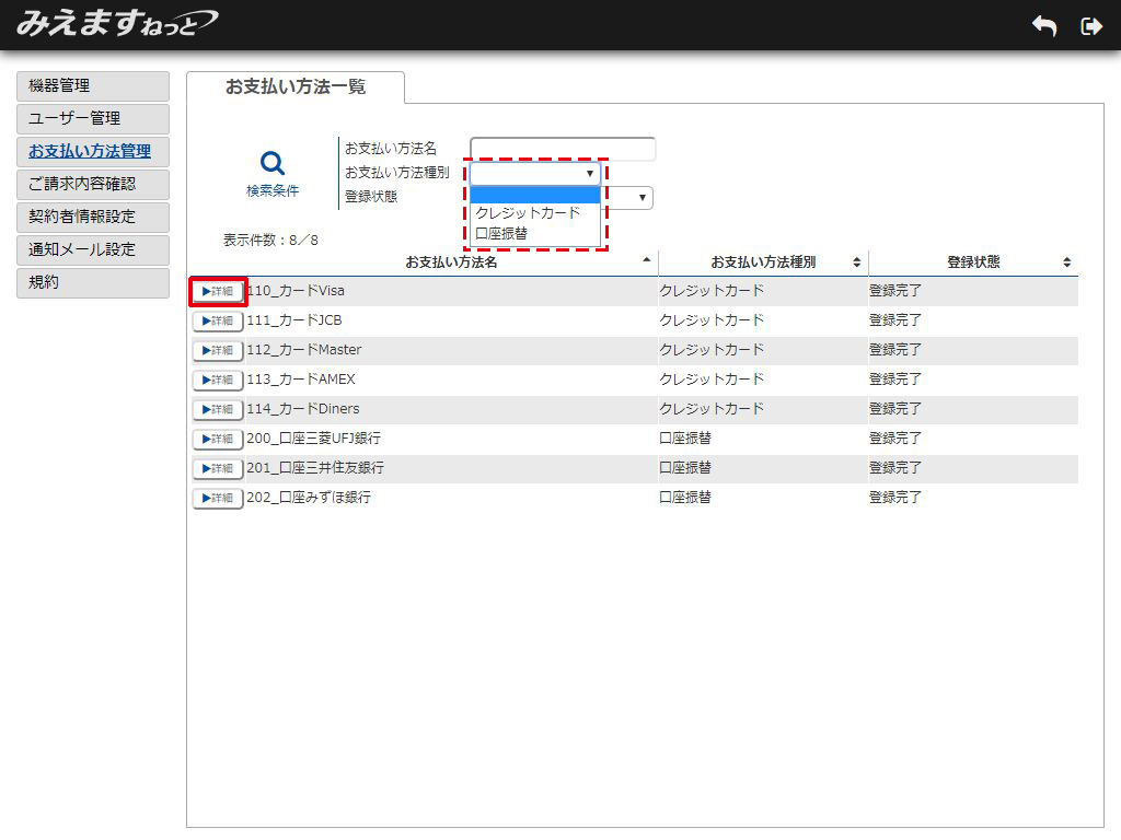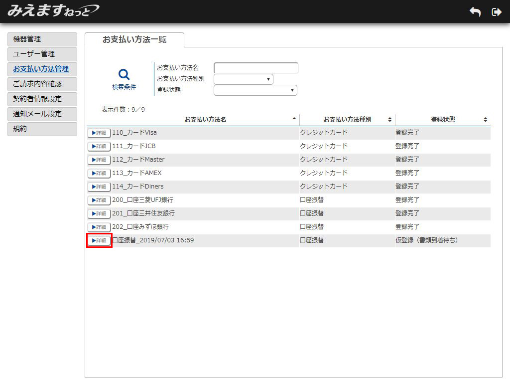 2.お支払い方法一覧画面が表示されます。確認したいお支払い方法名の「詳細」ボタンをクリックしてください。