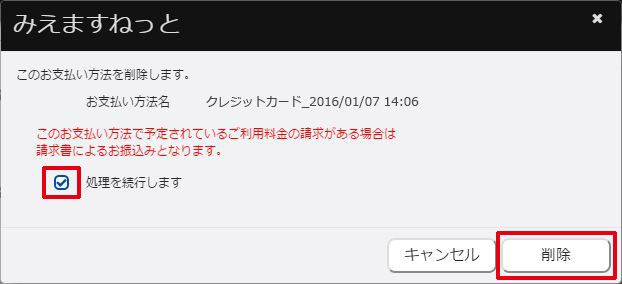 お支払い方法の削除を行わない場合は、「キャンセル」ボタンをクリックしてください。