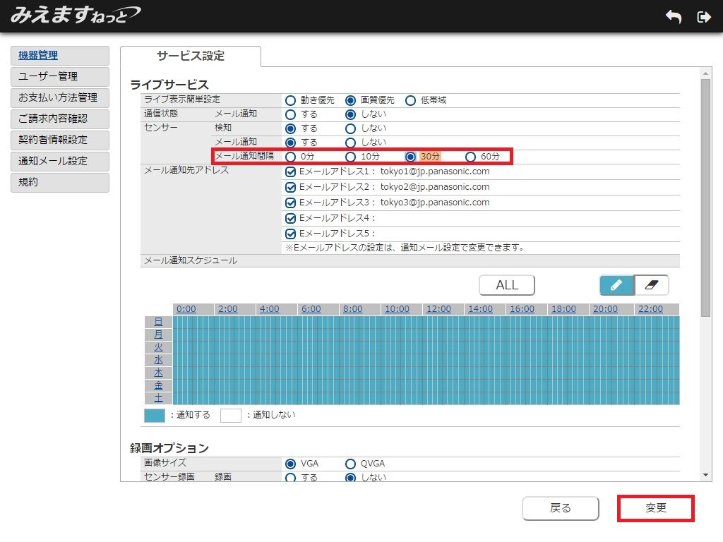 以上でセンサー情報検知時における、メール通知の間隔設定のお手続きが完了しました。
