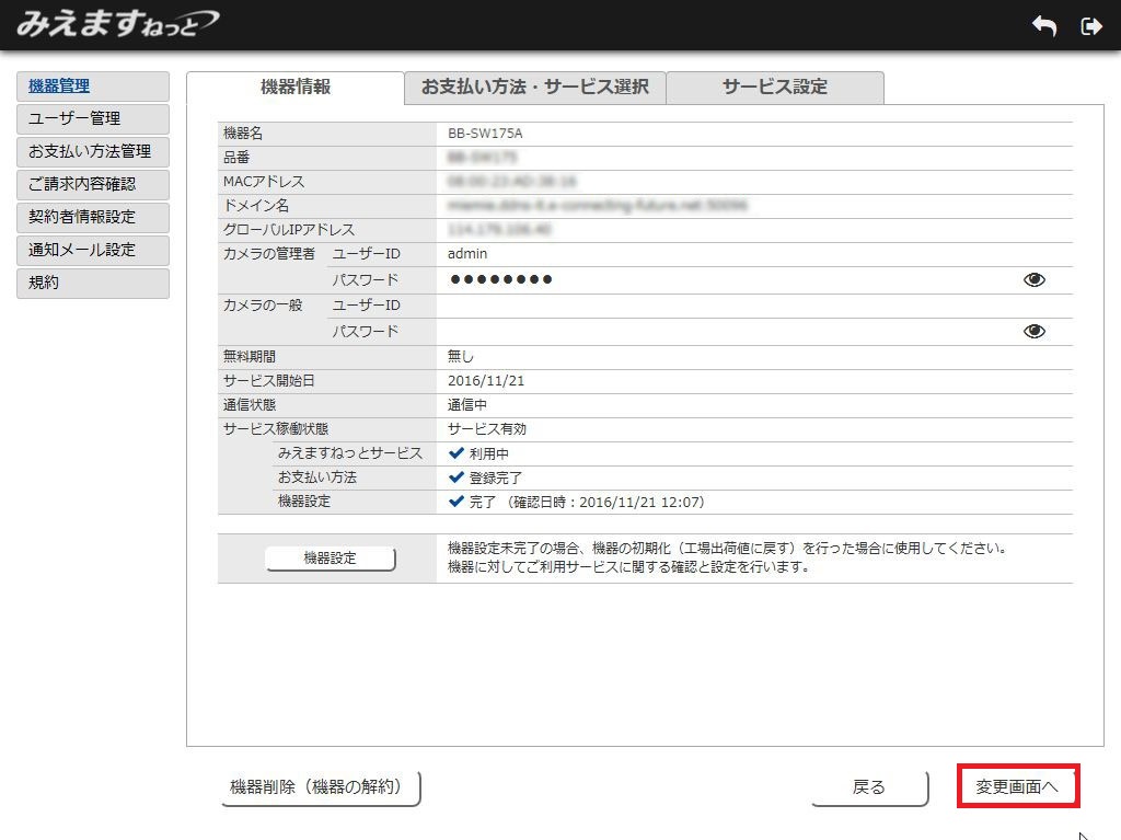 2.機器情報表示画面が表示されます。「変更画面へ」ボタンをクリックしてください。