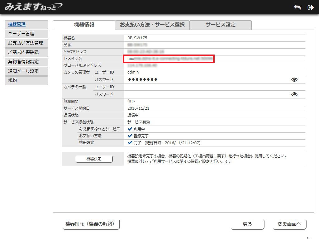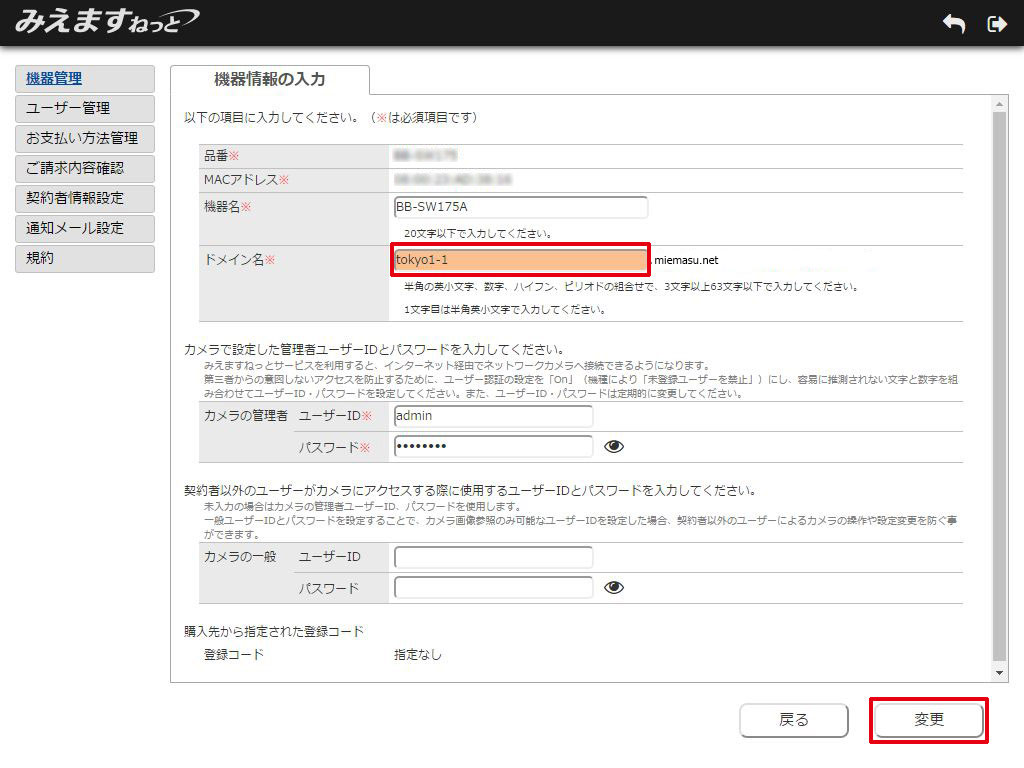 3.機器情報の入力画面が表示されます。ドメイン名入力欄に、変更するドメイン名を入力し、「変更」ボタンをクリックしてください。