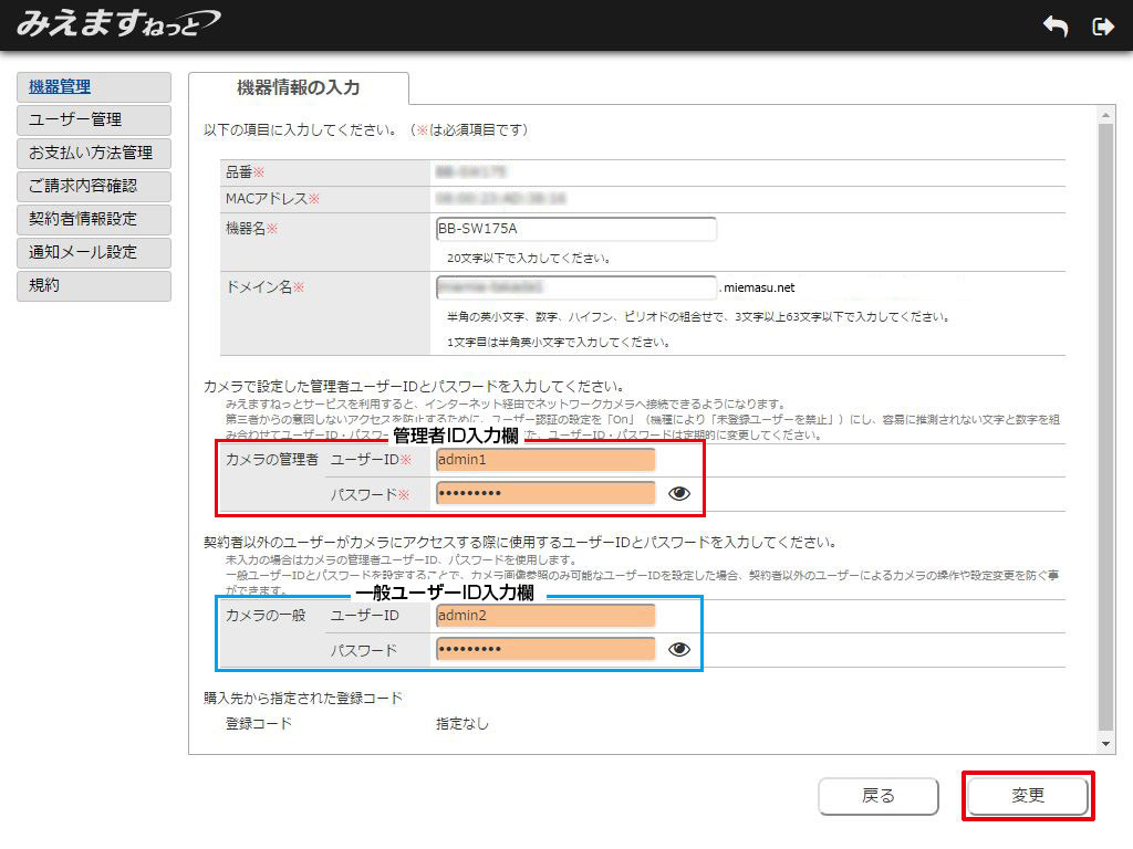 3.機器情報の入力画面が表示されます。ネットワークカメラの管理者ユーザーID入力欄と一般ユーザーID入力欄の両方またはいずれかに、ネットワークカメラに設定した情報を設定し、「変更」ボタンをクリックしてください。