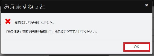 入力したユーザーID/パスワードが、ネットワークカメラに設定されている内容と違う場合、「機器設定ができませんでした」とメッセージが表示されます。