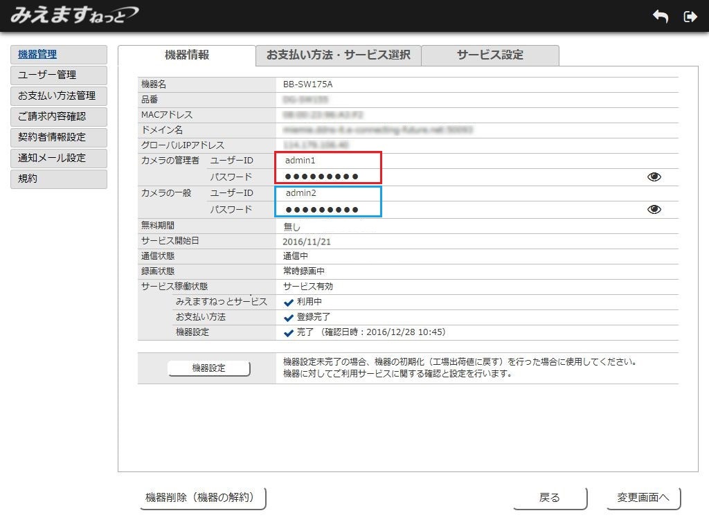 ネットワークカメラの画像をみえますねっとで見るには、ネットワークカメラ本体で設定した管理者・一般ユーザーのIDとパスワードを、みえますねっとサービスに設定する必要があります。