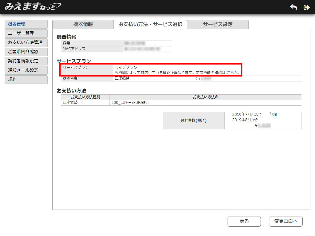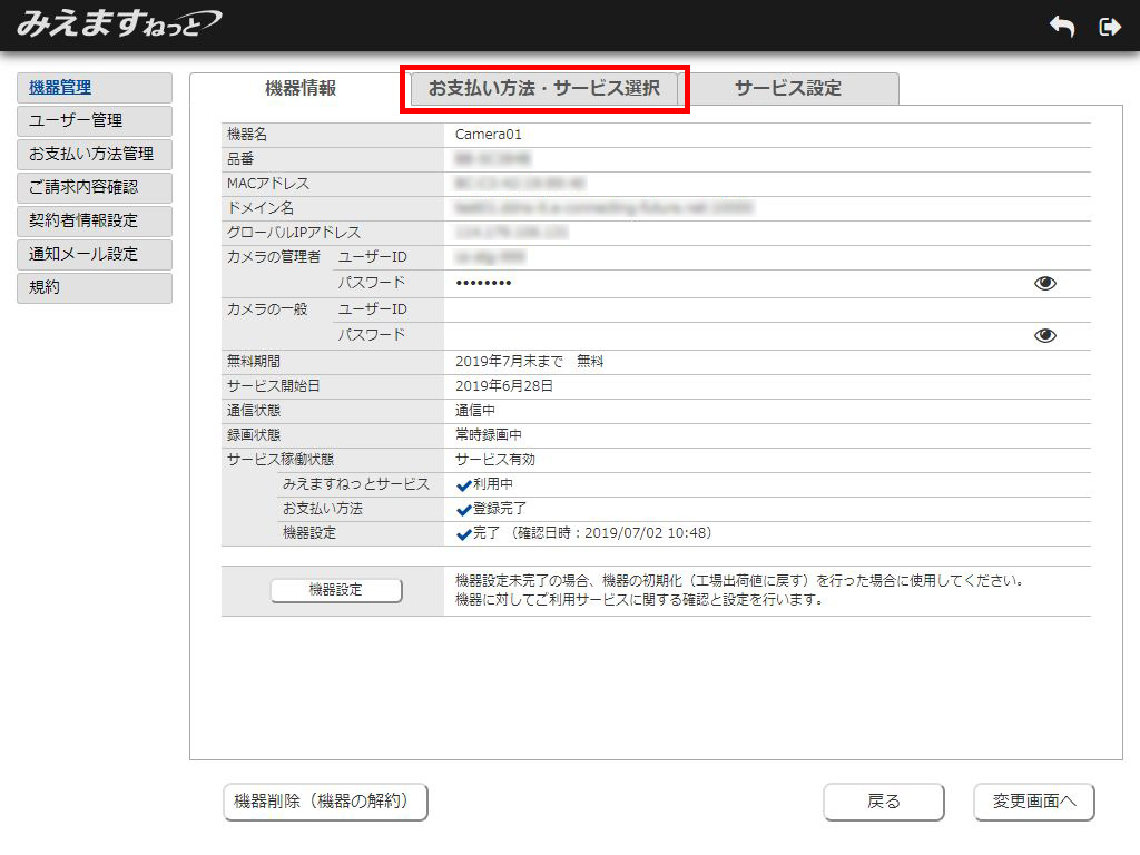 2.機器情報表示画面が表示されます。「お支払い方法・サービス選択」タブを選択してください。