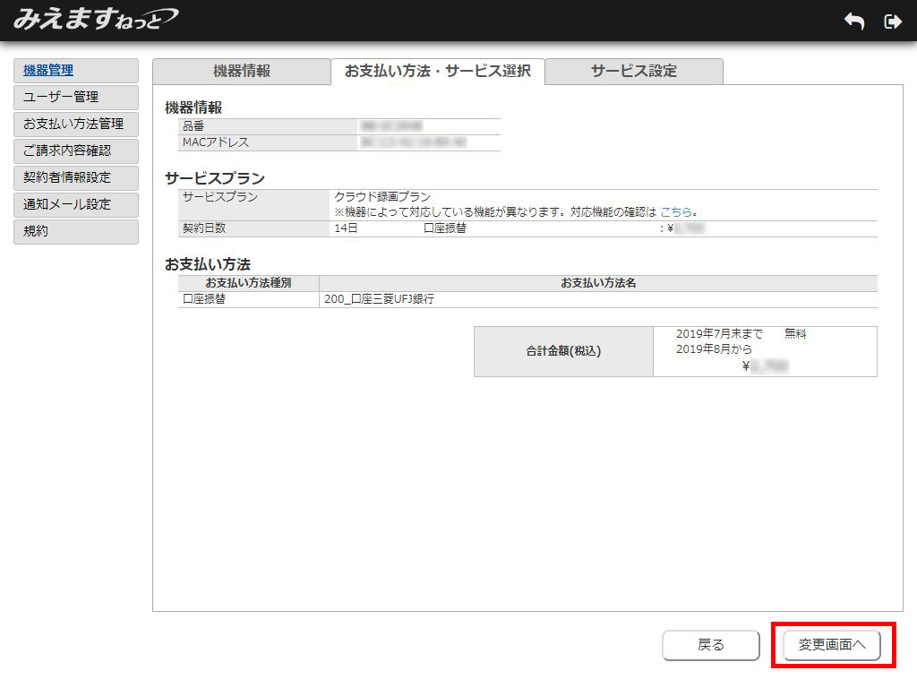 3.お支払い方法・サービス選択表示画面が表示されます。「変更画面へ」ボタンをクリックしてください。
