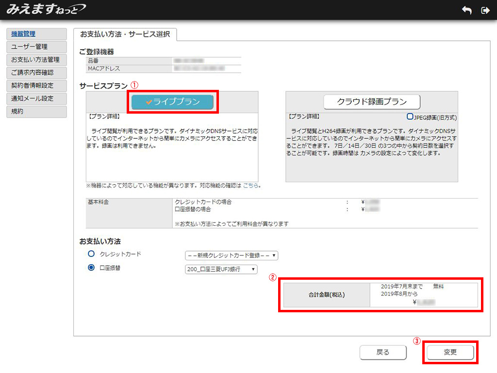 ※「ライブプラン」に変更すると、「クラウド録画プラン」または「録画プラン(JPEG録画)」で録画した画像はすべて削除されます。画像を保存する場合は、録画画像をダウンロードするをお読みの上、プランを変更する前に画像をダウンロードしてください。