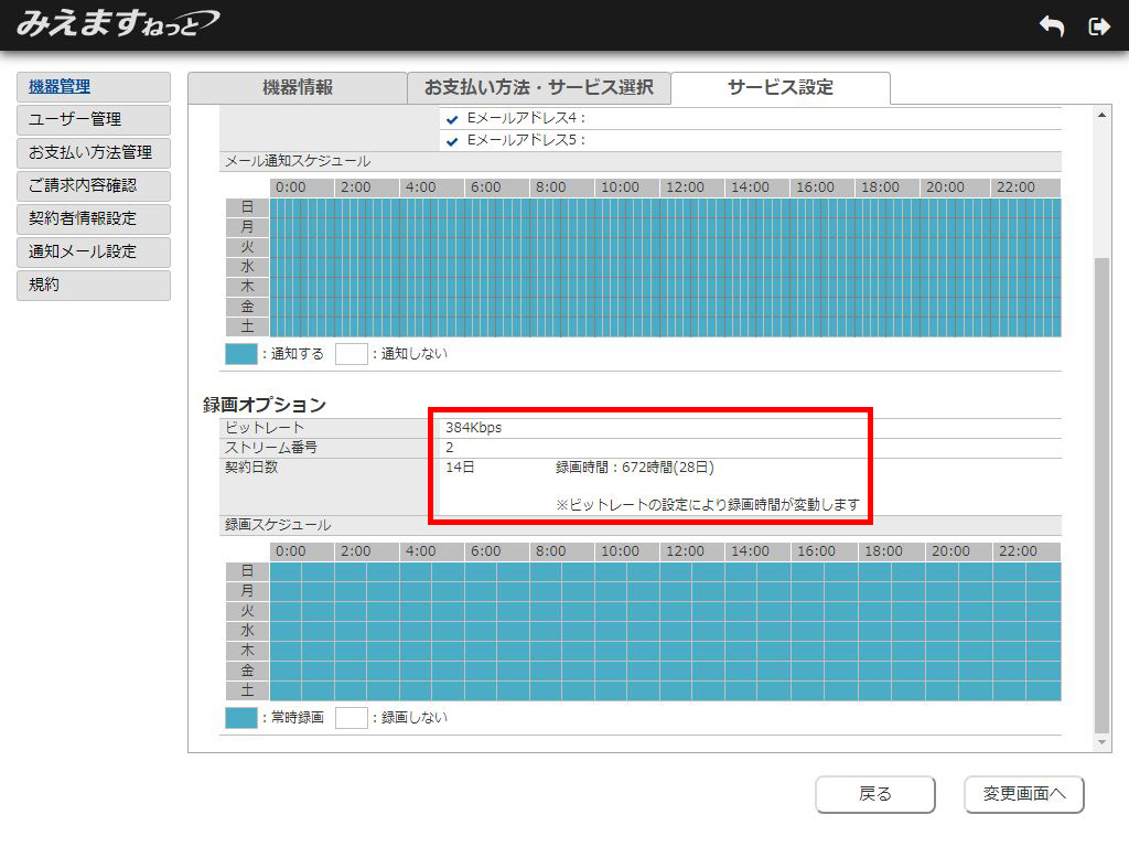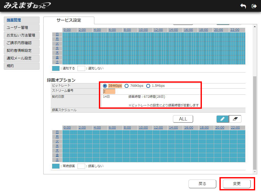 ビットレート設定欄で、「384Kbps」「768Kbps」「1.5Mbps」のいずれかを選択します。ビットレートの値を変更すると契約日数欄の「録画時間」に表示されている時間と日数が変動します。