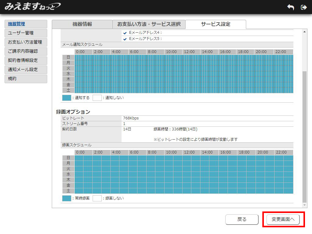 3.サービス設定表示画面が表示されます。「変更画面へ」ボタンをクリックしてください。