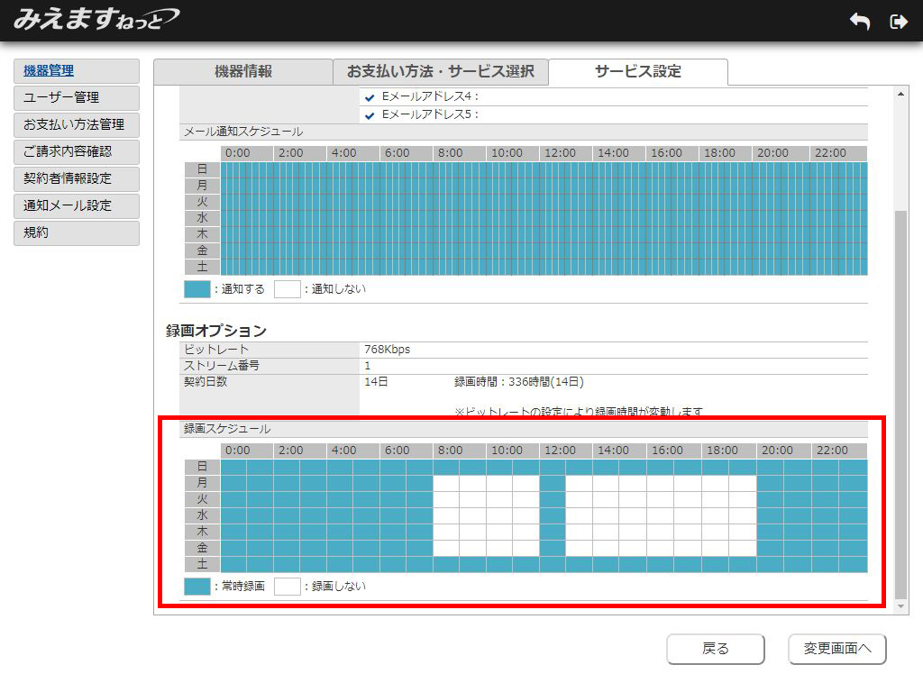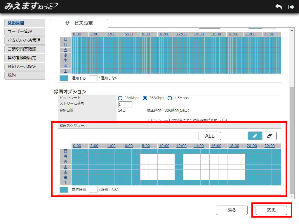 録画スケジュール設定欄にて、録画時間を設定し、「変更」ボタンをクリックしてください。