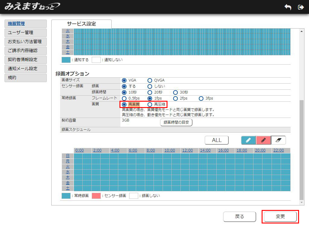 常時録画設定欄にて、「画質選択」ボタンから「高画質」または「高圧縮」を選択し、「変更」ボタンをクリックしてください。