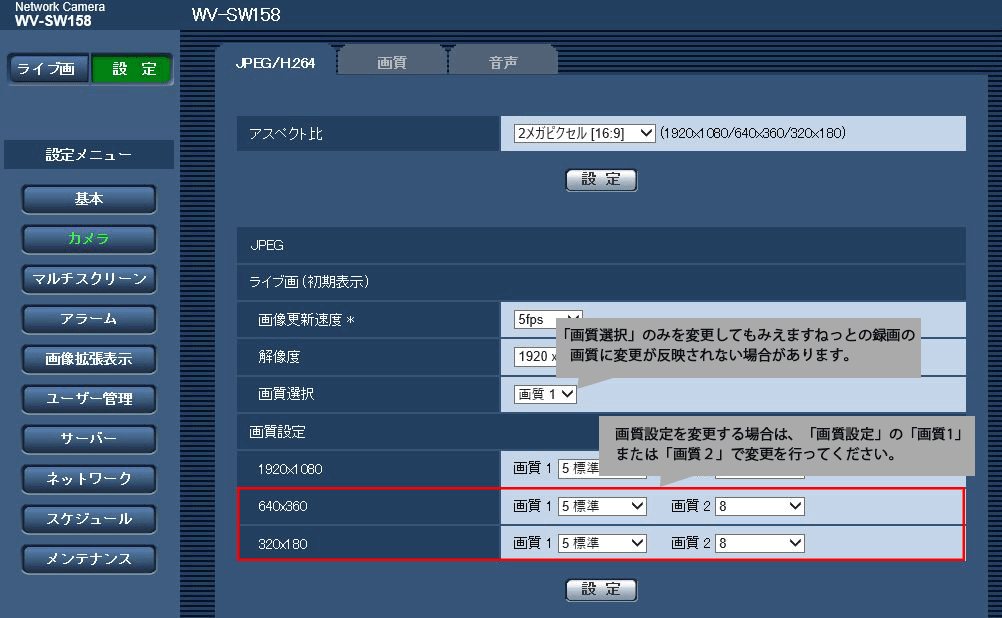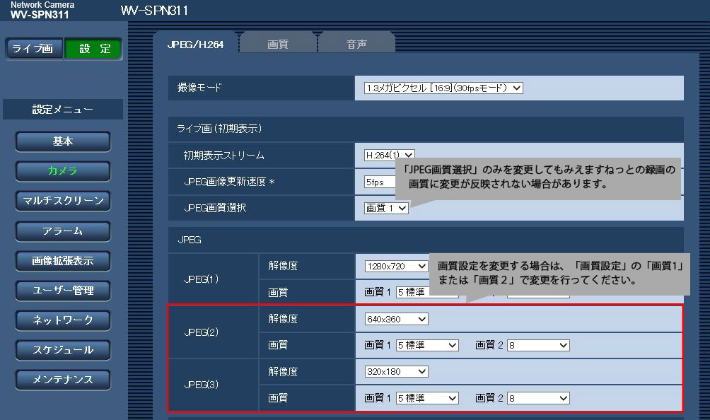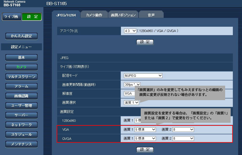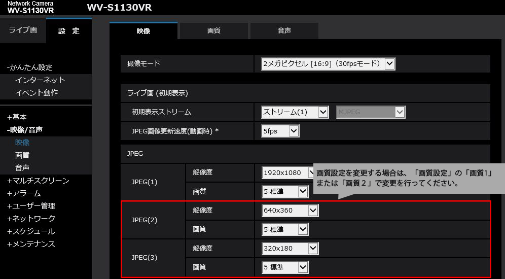 BB-S シリーズ / i-PRO シリーズでは、みえますねっとでの画質設定はありません。画質はネットワークカメラのJPEG画質設定に依存します。