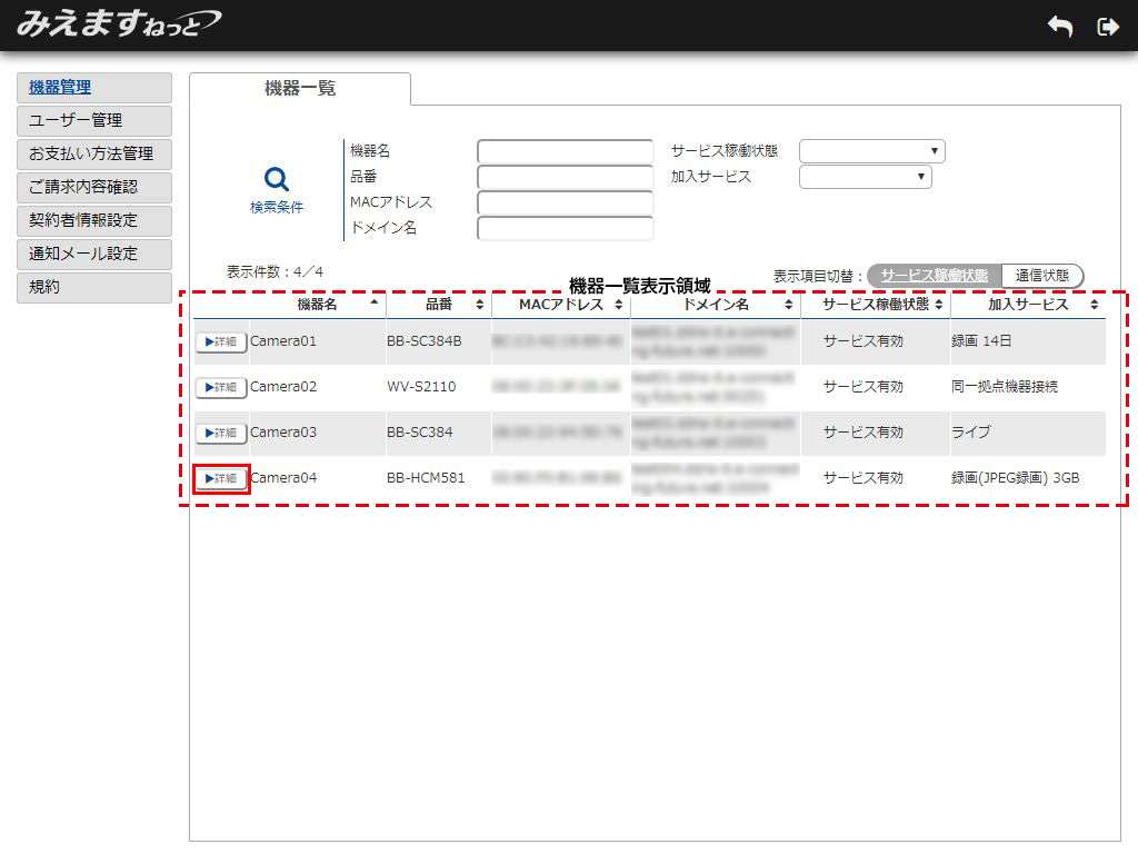 1.機器一覧表示領域から常時録画の画質を設定する機器の「詳細」ボタンをクリックしてください。