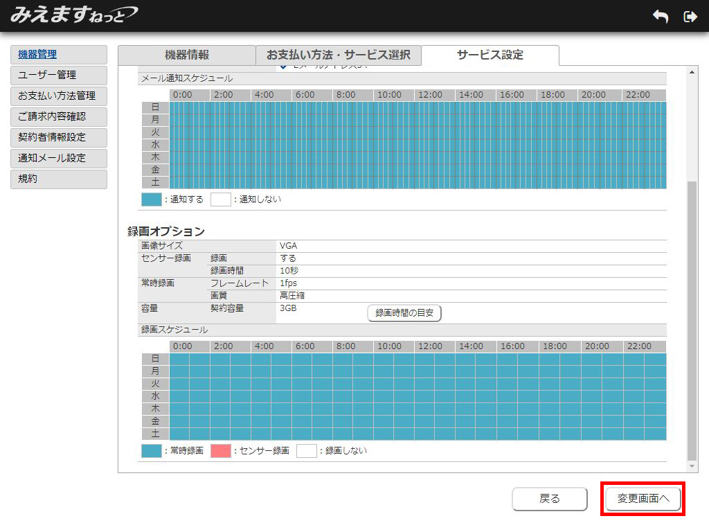 3.サービス設定表示画面が表示されます。「変更画面へ」ボタンをクリックしてください。