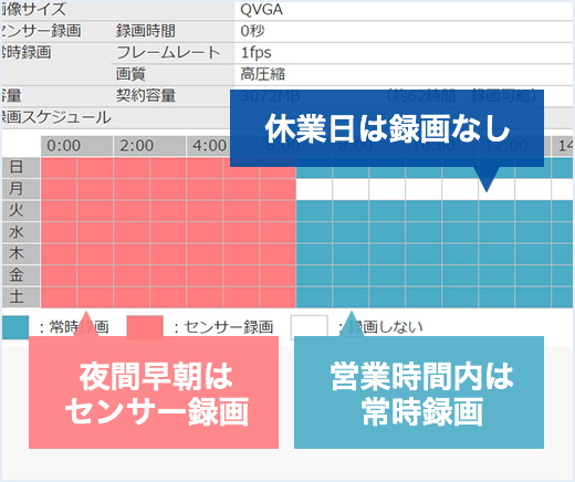 そんな場合は、録画する時間帯を指定することで、録画容量を効率的に使用することができます。時間帯は曜日毎に設定可能。業種業態や使用目的に応じて柔軟かつ、お得にお使いいただけます。