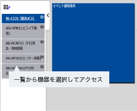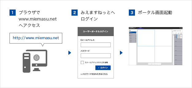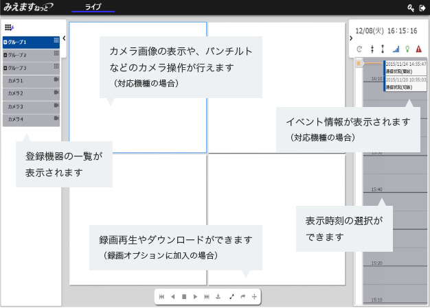 みえますねっとに登録した機器へ簡単にアクセスできる、入り口となる画面です。ログインサイトから、登録したEメールアドレスとパスワードでログインするだけで、登録した機器の一覧が確認できます。また、ご利用の機器の機能やオプション加入状況に応じて、ライブ画像の閲覧や録画画像の再生、パンチルトなどのカメラ操作や、動作検知などイベント発生状況の確認を行うことができます。