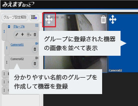 ポータル画面から、複数の機器をたばねた「グループ」を作成することが出来ます。グループ内の機器の画像は並べて表示することができ、ドラッグで簡単に並べ替え可能。