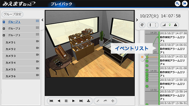 イベント一覧から録画部分を簡単に頭出しできるので、イベントが発生した時の状況を素早く確認することができます。