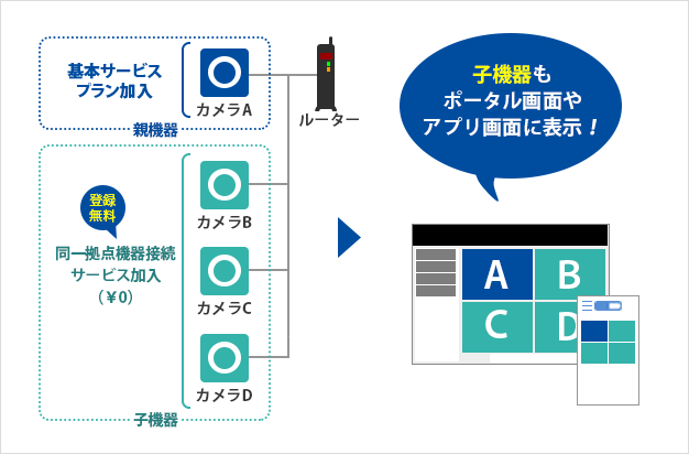 基本サービスプランご加入の機器と同じ場所に設置(同じルーター接続)されている機器であれば、無料の「同一拠点機器接続サービス」(子機器追加)がご利用いただけます。 子機器として登録したカメラは、基本サービスプラン加入機器と同様、ポータル画面やみえますねっとビューアー上でライブ表示することができます。