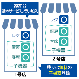 複数の店舗をお持ちの場合は、各店舗1台ずつ、基本サービスプランへご加入ください。基本サービスプラン加入1台あたり10台まで、無料の子機器追加がご利用いただけます。 レジや出入り口に設置したカメラを親機器として登録すると、録画機能や動体検知などのセンサー機能を活用できるのでおすすめです。