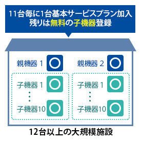 施設内に12台以上の機器がある場合、11台につき1台ずつ、基本サービスプランへご加入ください。例えば基本サービスプランへ2台加入した場合、無料の子機器を20台まで追加登録可能です。 基本サービスプラン加入の機器は、録画機能やセンサー機能が利用できるので、受付や出入り口などに設置したカメラの選択がおすすめです。