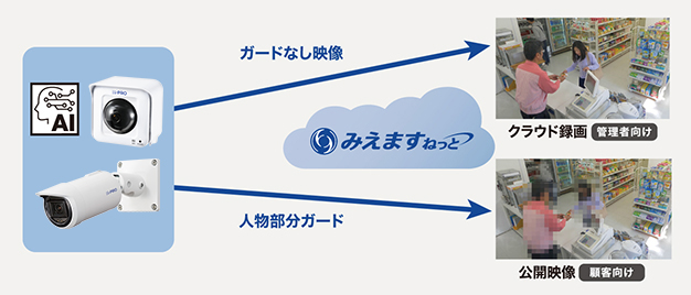 みえますねっとを使うと、このモザイク処理映像を、遠隔からモニタリングあるいはクラウド録画ができますので、プライバシーに配慮しながら遠隔から現場を確認することができます。